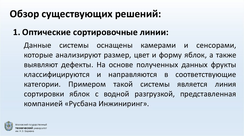 Обзор существующих решений:1. Оптические сортировочные линии: