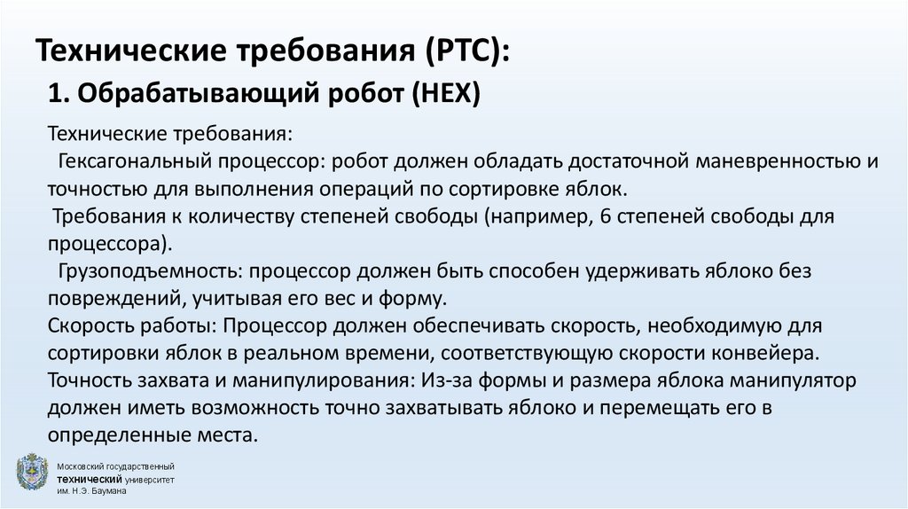 Технические требования (РТС):1. Обрабатывающий робот (HEX)