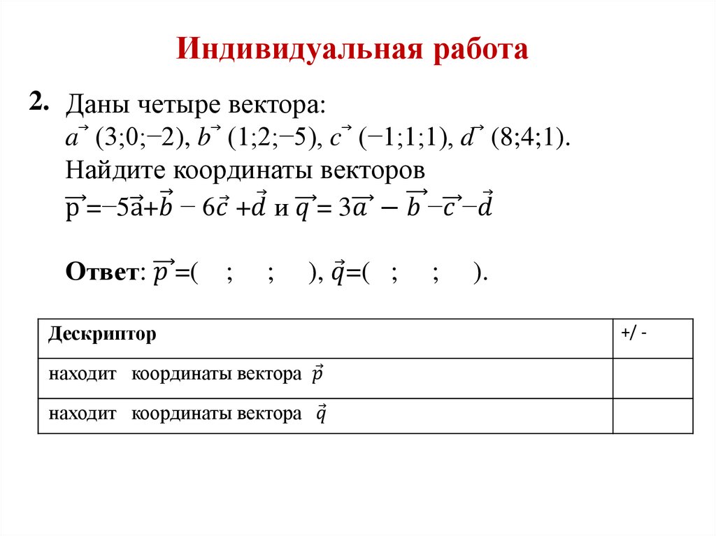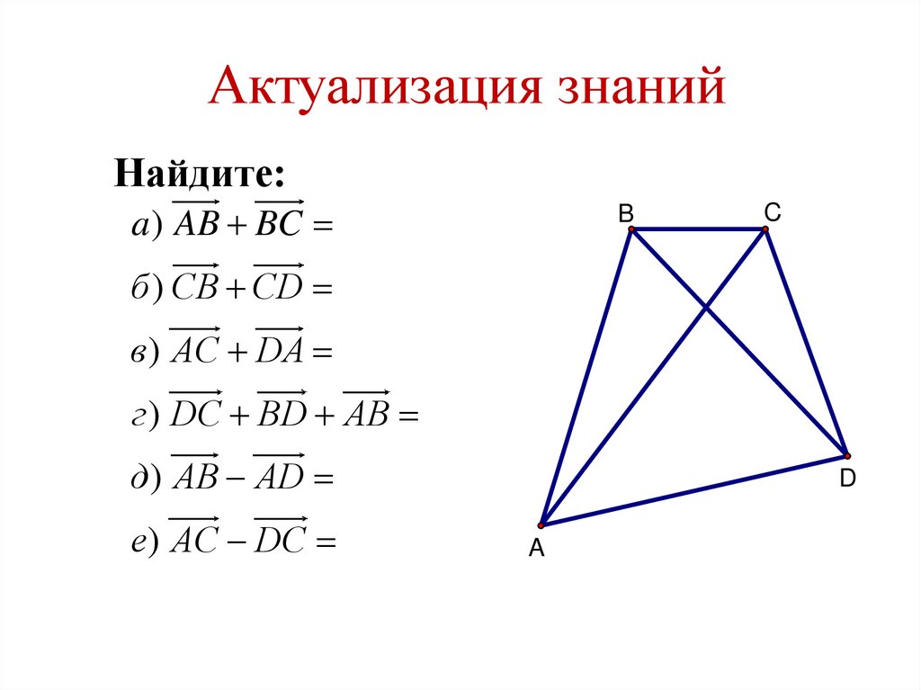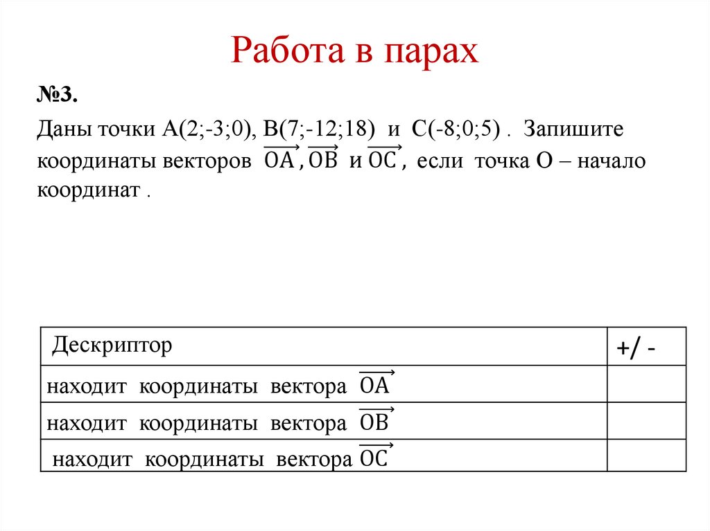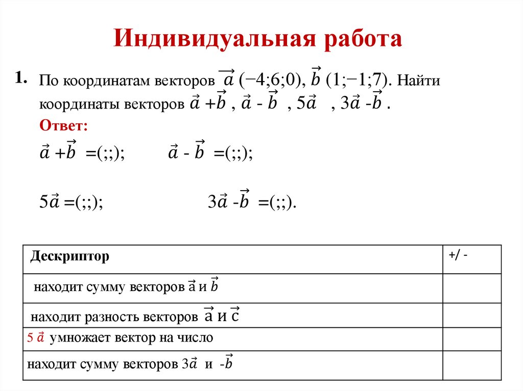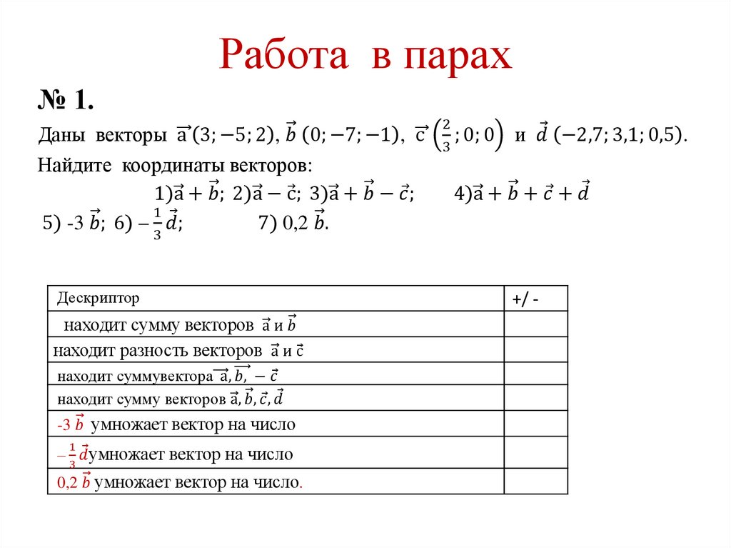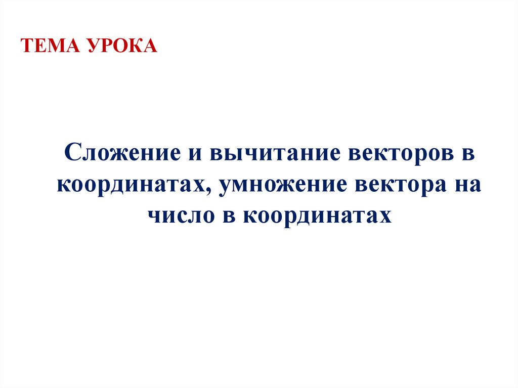 Сложение и вычитание векторов в координатах, умножение вектора на число в координатах