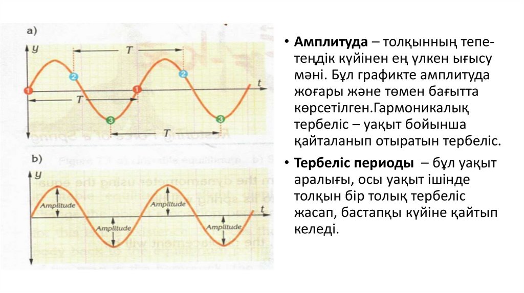 • Амплитуда – толқынның тепетеңдік күйінен ең үлкен ығысумәні. Бұл графикте амплитуда