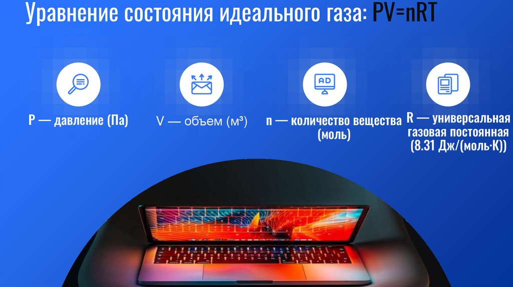 Уравнение состояния идеального газа: PV=nRTP — давление (Па)