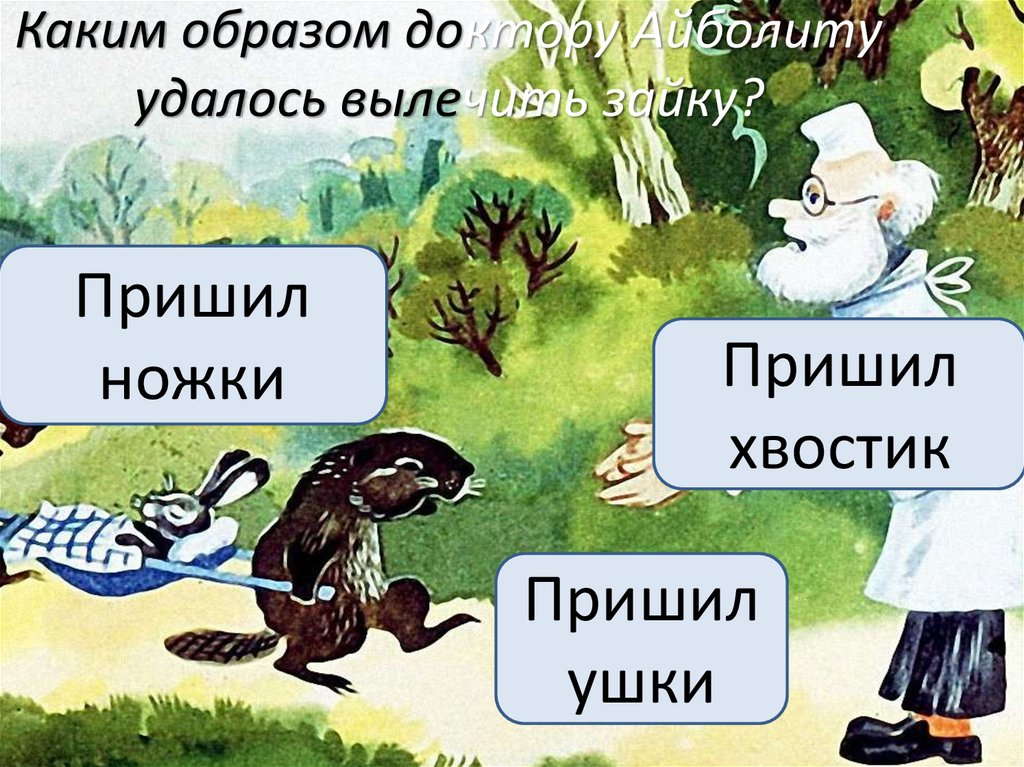 Каким образом доктору Айболитуудалось вылечить зайку?
