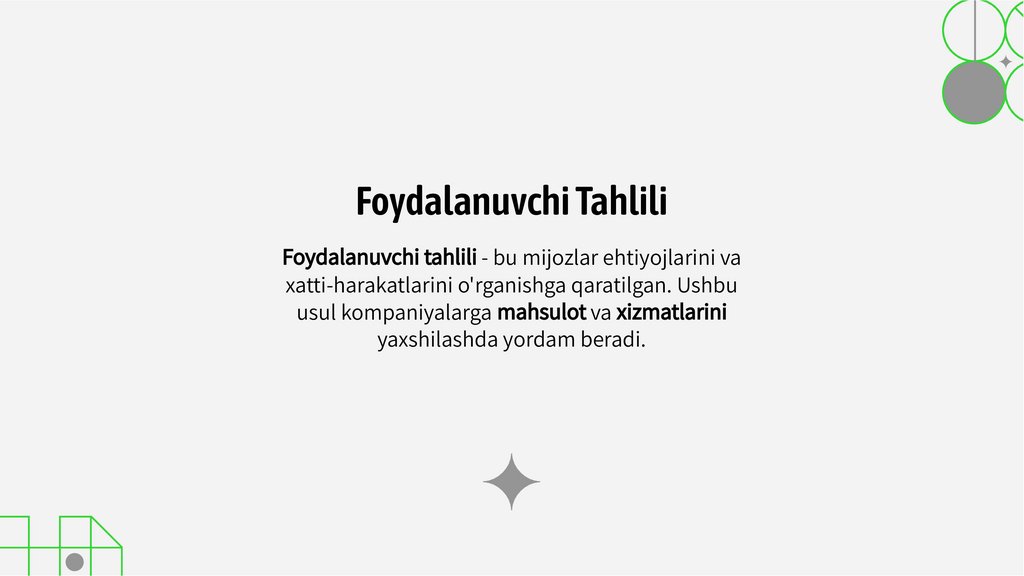 Foydalanuvchi TahliliFoydalanuvchi tahlili - bu mijozlar ehtiyojlarini va