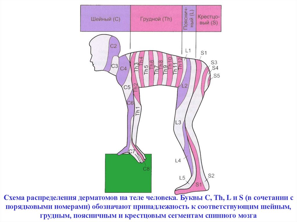 Схема распределения дерматомов на теле человека. Буквы C, Th, L и S (в сочетании спорядковыми номерами) обозначают принадлежность к соответствующим шейным,