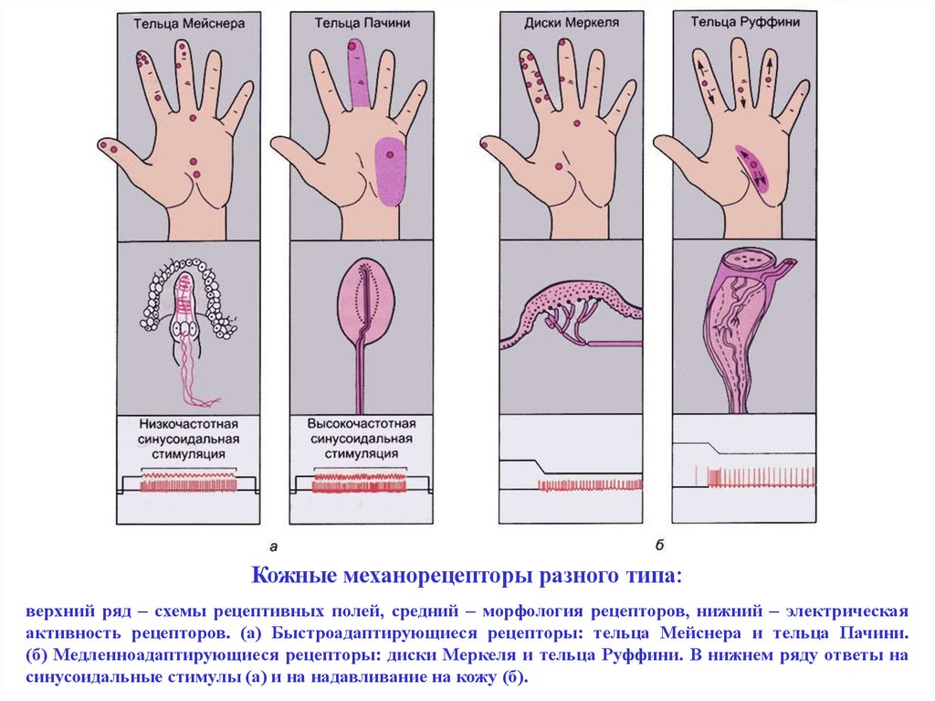 Кожные механорецепторы разного типа:верхний ряд – схемы рецептивных полей, средний – морфология рецепторов, нижний – электрическая