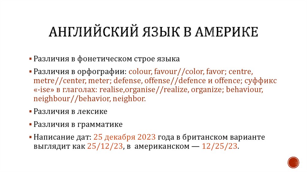 Различия в фонетическом строе языкаРазличия в орфографии: colour, favour//color, favor; centre,
