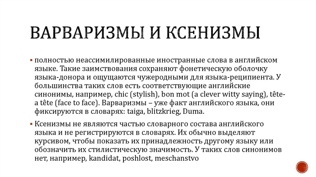 синонимы, например, chic (stylish), bon mot (a clever witty saying), têtea tête (face to face). Варваризмы – уже факт английского языка, они