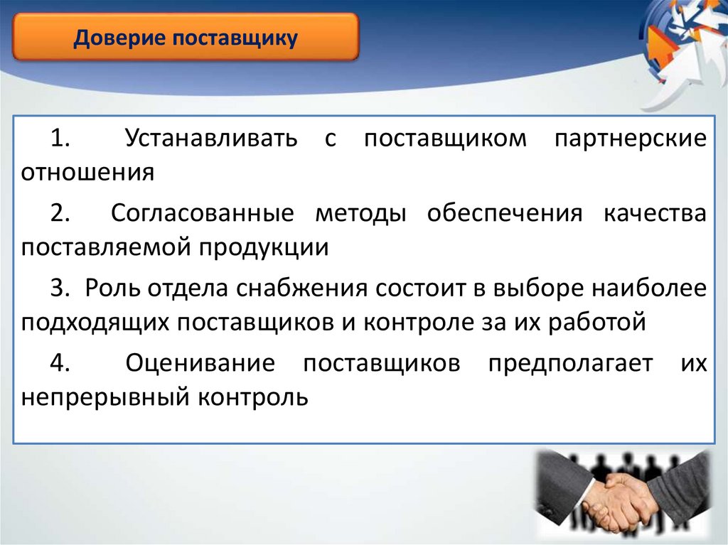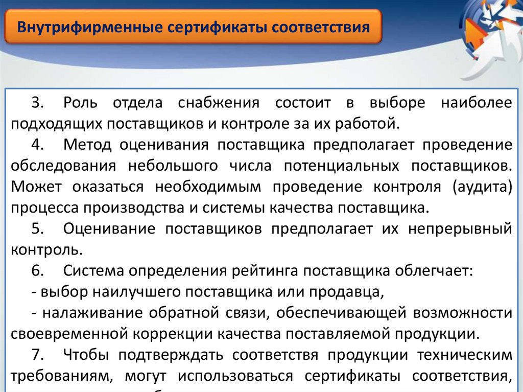 Внутрифирменные сертификаты соответствия3. Роль отдела снабжения состоит в выборе наиболее