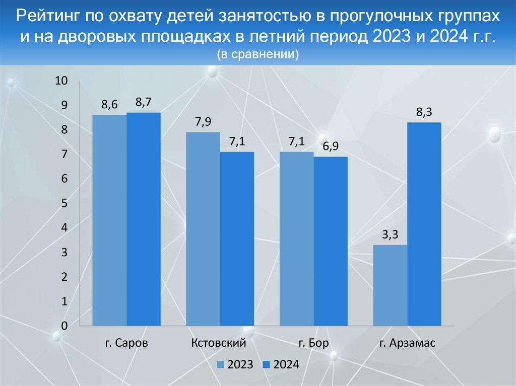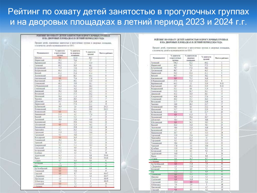 Рейтинг по охвату детей занятостью в прогулочных группах и на дворовых площадках в летний период 2023 и 2024 г.г