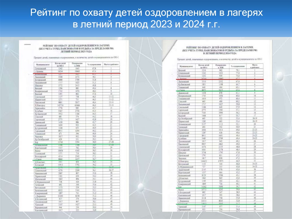 Рейтинг по охвату детей оздоровлением в лагеряхв летний период 2023 и 2024 г.г.