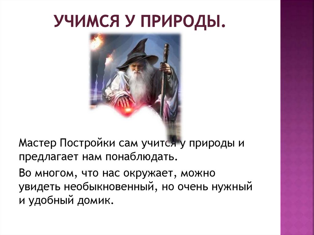 Мастер Постройки сам учится у природы ипредлагает нам понаблюдать.