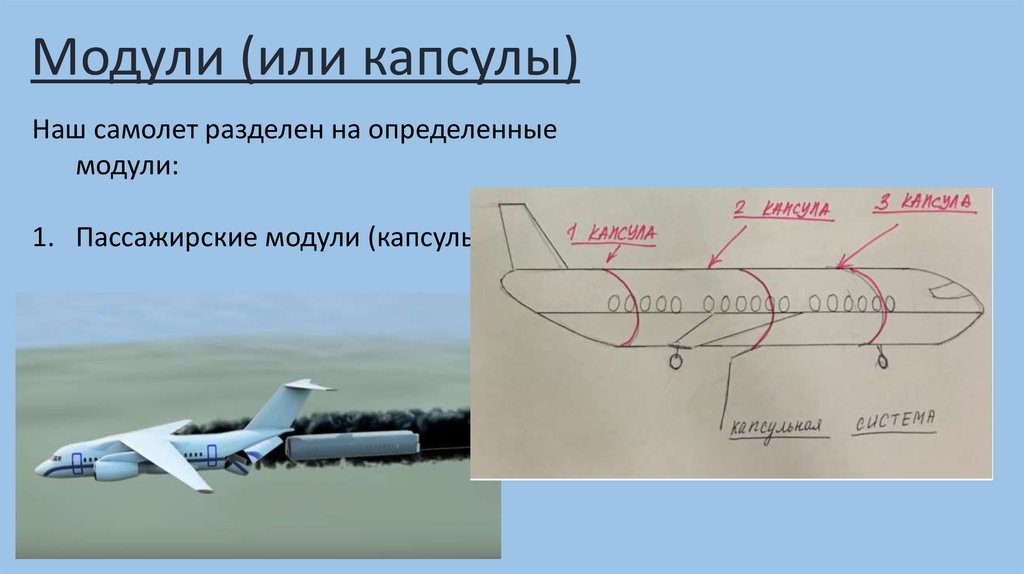 Чертеж: система модулейРабота система погрузки багажа, а также деление самолета на три капсулы