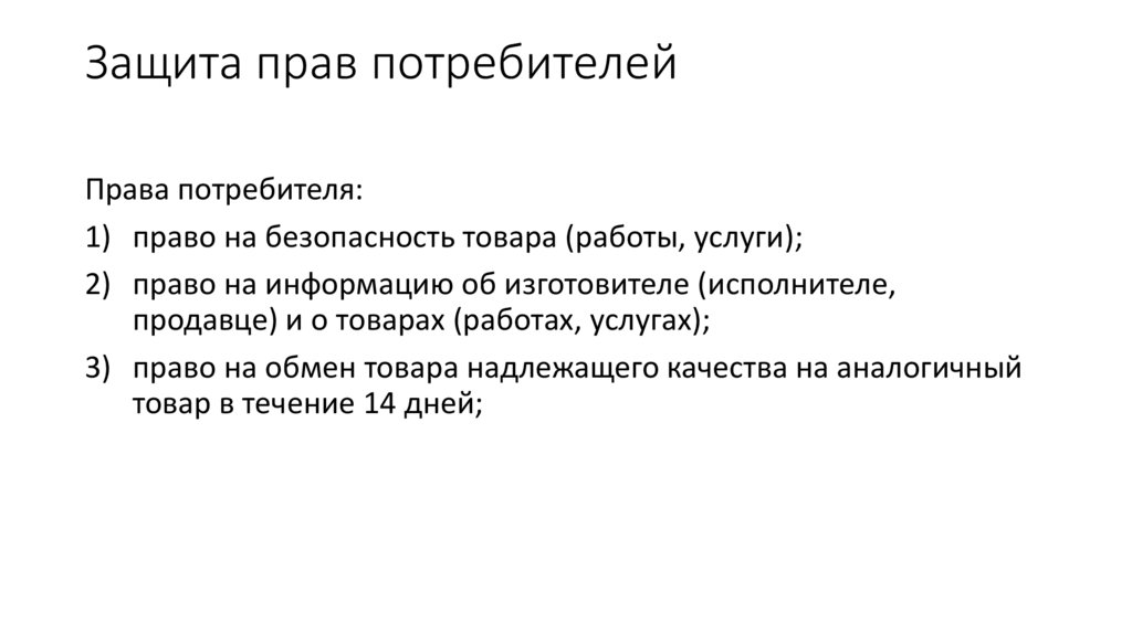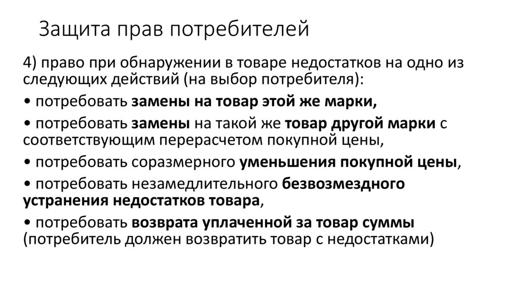 Защита прав потребителей4) право при обнаружении в товаре недостатков на одно из
