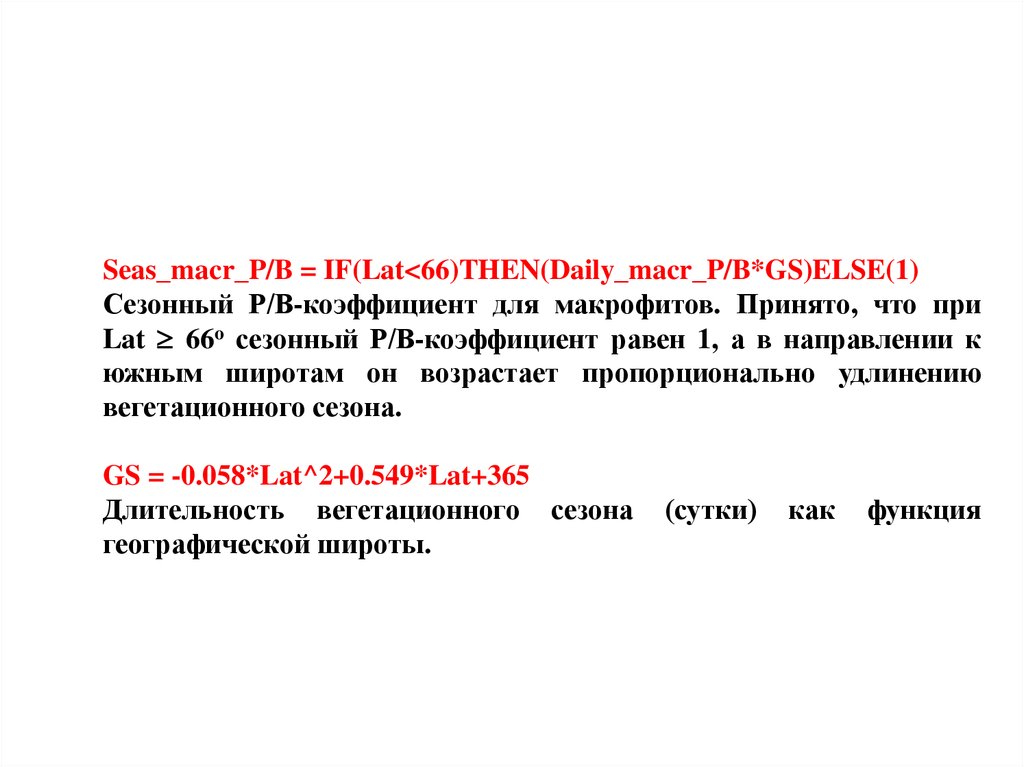 Seas_macr_P/B = IF(Lat<66)THEN(Daily_macr_P/B*GS)ELSE(1)Сезонный Р/В-коэффициент для макрофитов. Принято, что при
