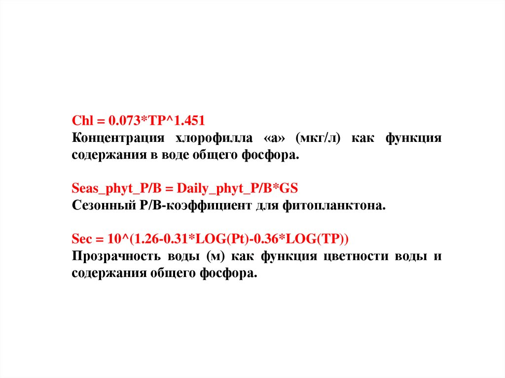 Chl = 0.073*TP^1.451Концентрация хлорофилла «а» (мкг/л) как функция