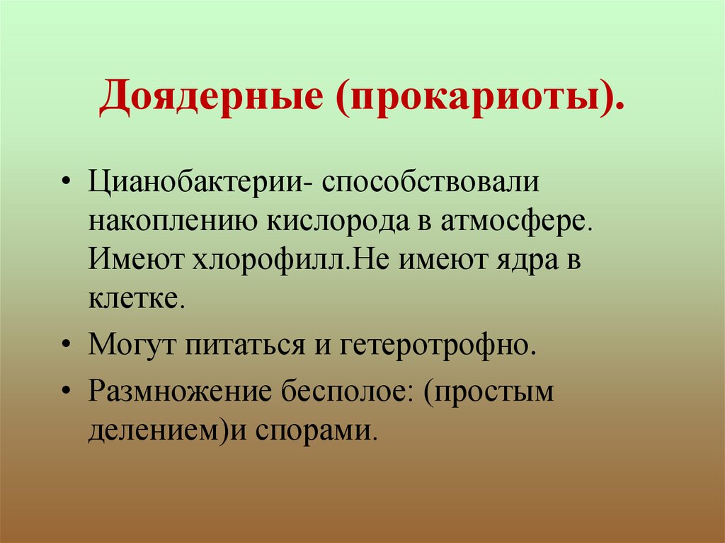 Доядерные (прокариоты).• Цианобактерии- способствовали