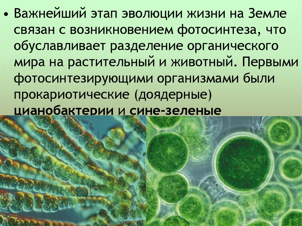 • Важнейший этап эволюции жизни на Землесвязан с возникновением фотосинтеза, что