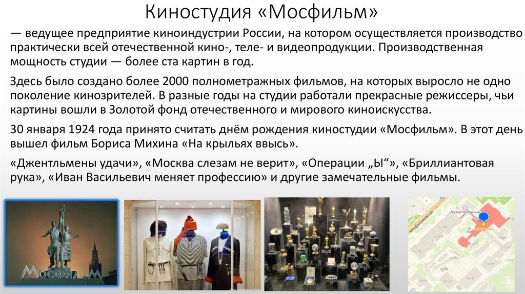 Киностудия «Мосфильм»— ведущее предприятие киноиндустрии России, на котором осуществляется производство