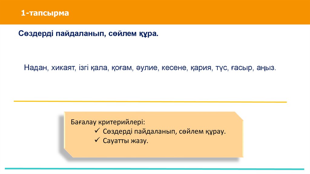 1-тапсырмаСөздерді пайдаланып, сөйлем құра.