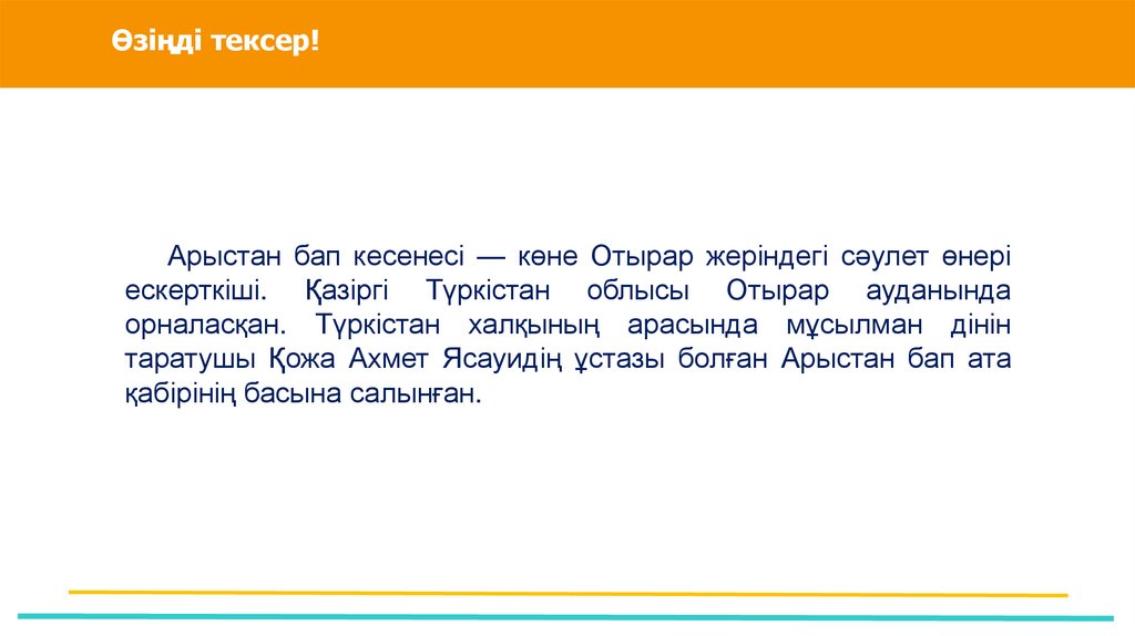 Өзіңді тексер!Арыстан бап кесенесі — көне Отырар жеріндегі сәулет өнері