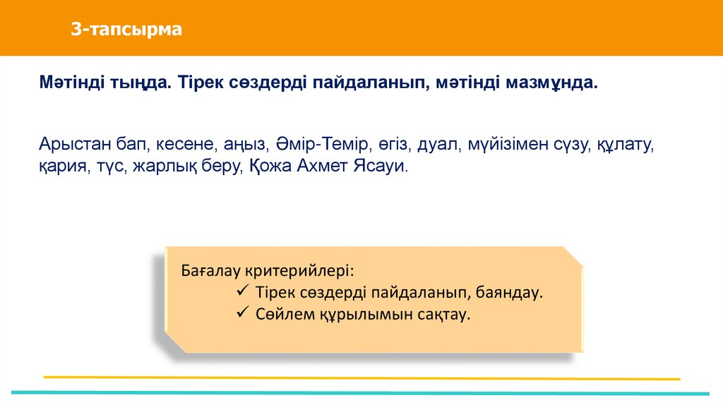 3-тапсырмаМәтінді тыңда. Тірек сөздерді пайдаланып, мәтінді мазмұнда.