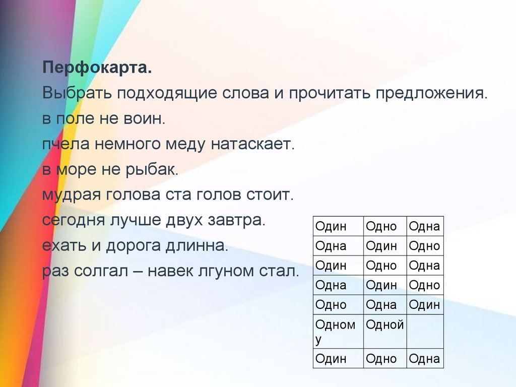 Перфокарта.Выбрать подходящие слова и прочитать предложения.