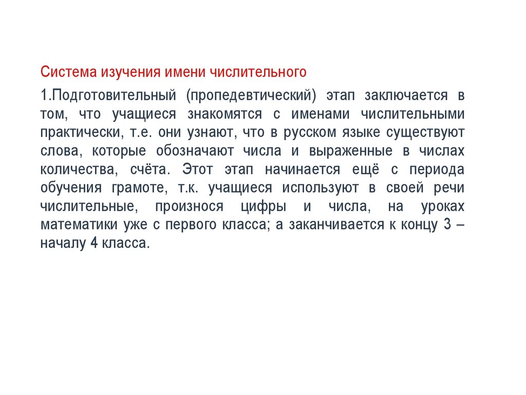 Система изучения имени числительного1.Подготовительный (пропедевтический) этап заключается в