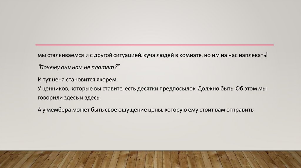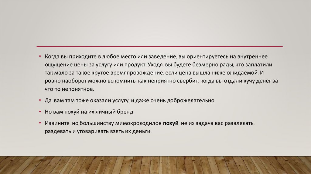 • Когда вы приходите в любое место или заведение, вы ориентируетесь на внутреннееощущение цены за услугу или продукт. Уходя, вы будете безмерно рады, что заплатили