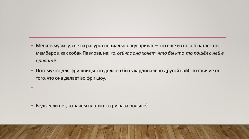 • Менять музыку, свет и ракурс специально под приват — это еще и способ натаскатьмемберов, как собак Павлова, на: «о, сейчас она хочет, что бы кто-то пошёл с ней в