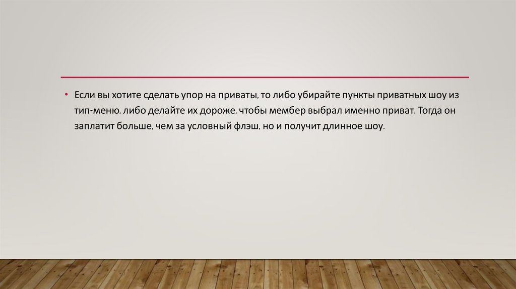 • Если вы хотите сделать упор на приваты, то либо убирайте пункты приватных шоу изтип-меню, либо делайте их дороже, чтобы мембер выбрал именно приват. Тогда он