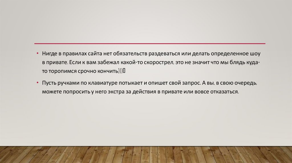 • Нигде в правилах сайта нет обязательств раздеваться или делать определенное шоув привате. Если к вам забежал какой-то скорострел, это не значит что мы блядь кудато торопимся срочно кончить)))0