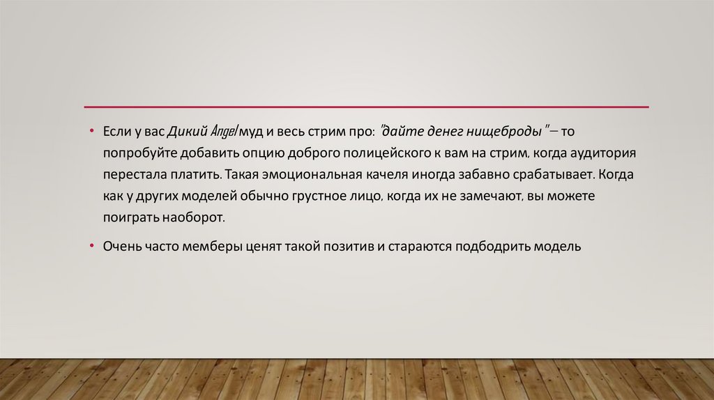 • Если у вас Дикий Angel муд и весь стрим про: "дайте денег нищеброды" — топопробуйте добавить опцию доброго полицейского к вам на стрим, когда аудитория