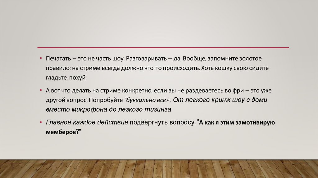 • Печатать — это не часть шоу. Разговаривать — да. Вообще, запомните золотоеправило: на стриме всегда должно что-то происходить. Хоть кошку свою сидите