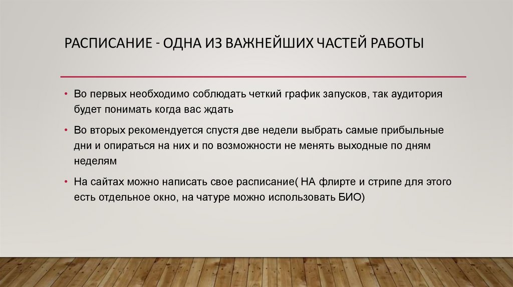 РАСПИСАНИЕ - ОДНА ИЗ ВАЖНЕЙШИХ ЧАСТЕЙ РАБОТЫ• Во первых необходимо соблюдать четкий график запусков, так аудитория