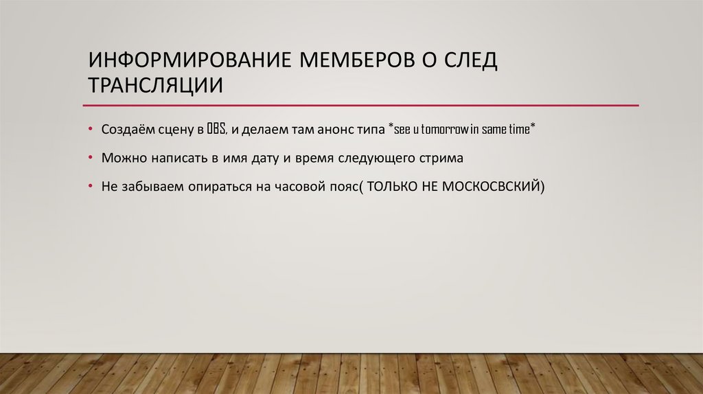 • Создаём сцену в OBS, и делаем там анонс типа *see u tomorrow in same time*