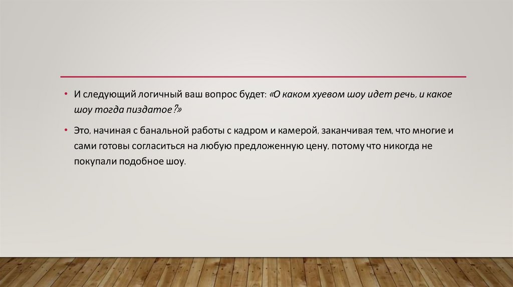 • И следующий логичный ваш вопрос будет: «О каком хуевом шоу идет речь, и какоешоу тогда пиздатое?»