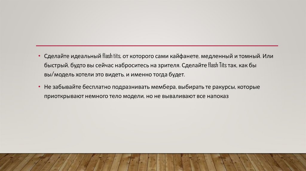 • Сделайте идеальный flash tits, от которого сами кайфанете, медленный и томный. Илибыстрый, будто вы сейчас наброситесь на зрителя. Сделайте flash Tits так, как бы