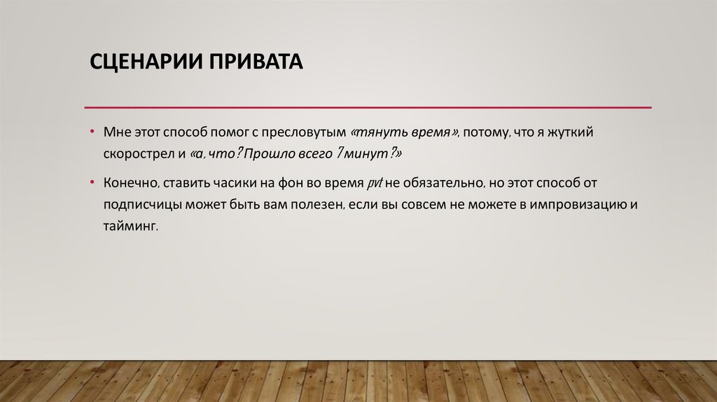 СЦЕНАРИИ ПРИВАТА• Мне этот способ помог с пресловутым «тянуть время», потому, что я жуткий