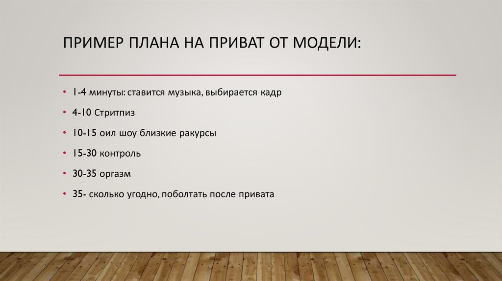 ПРИМЕР ПЛАНА НА ПРИВАТ ОТ МОДЕЛИ:• 1-4 минуты: ставится музыка, выбирается кадр