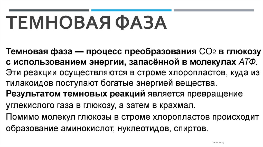 ТЕМНОВАЯ ФАЗАТемновая фаза — процесс преобразования CO2 в глюкозу