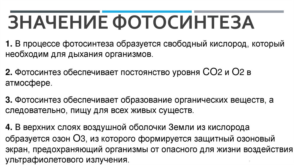 ЗНАЧЕНИЕ ФОТОСИНТЕЗА1. В процессе фотосинтеза образуется свободный кислород, который