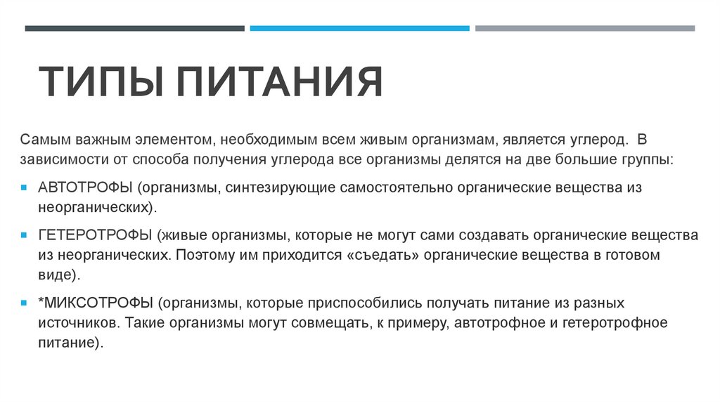 ТИПЫ ПИТАНИЯСамым важным элементом, необходимым всем живым организмам, является углерод. В