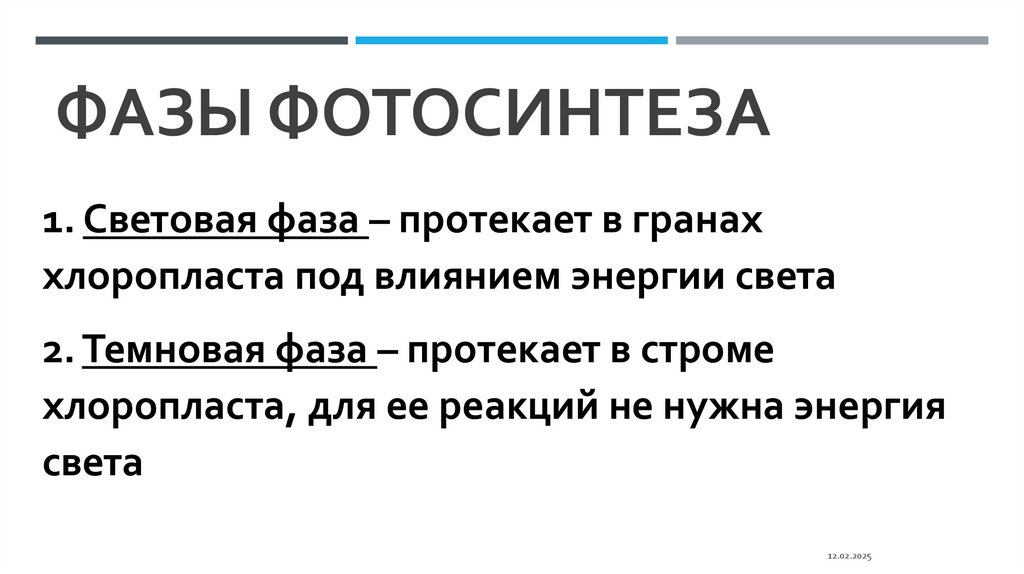 ФАЗЫ ФОТОСИНТЕЗА1. Световая фаза – протекает в гранах