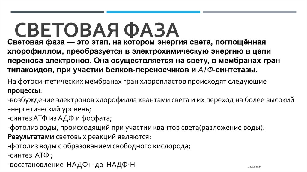 СВЕТОВАЯ ФАЗАСветовая фаза — это этап, на котором энергия света, поглощённая