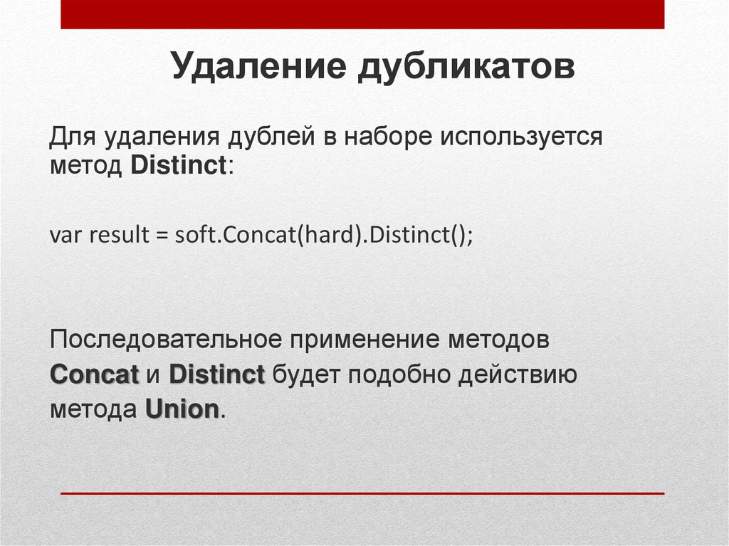 Удаление дубликатовДля удаления дублей в наборе используется