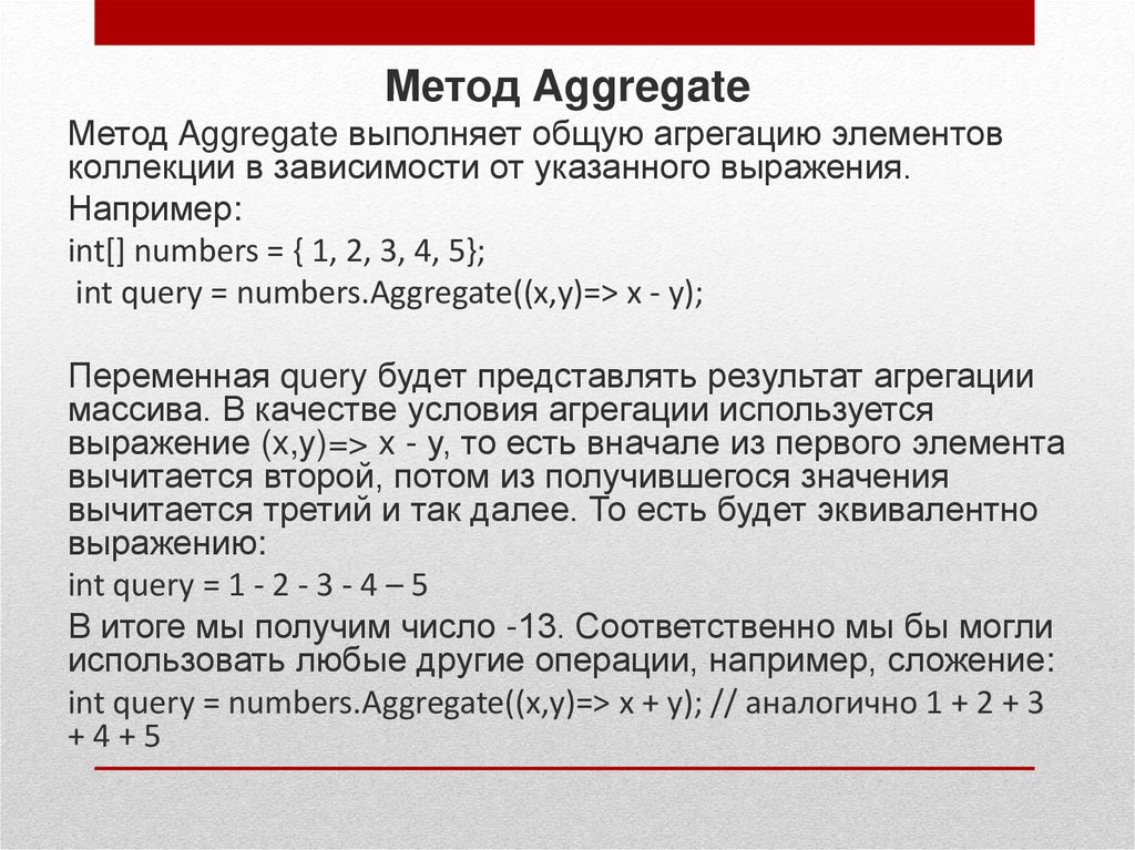 Метод AggregateМетод Aggregate выполняет общую агрегацию элементов