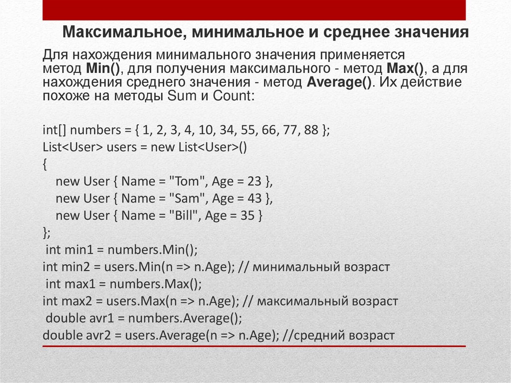 нахождения среднего значения - метод Average(). Их действие