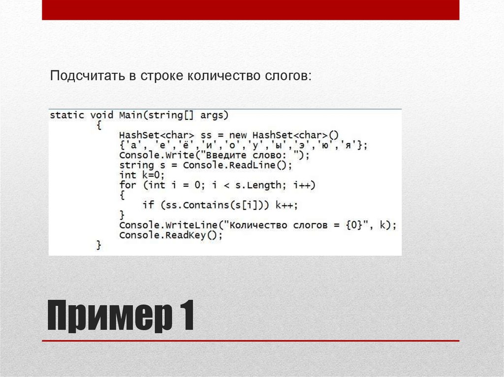 Подсчитать в строке количество слогов:Пример 1