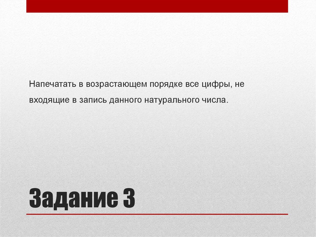 Напечатать в возрастающем порядке все цифры, невходящие в запись данного натурального числа.