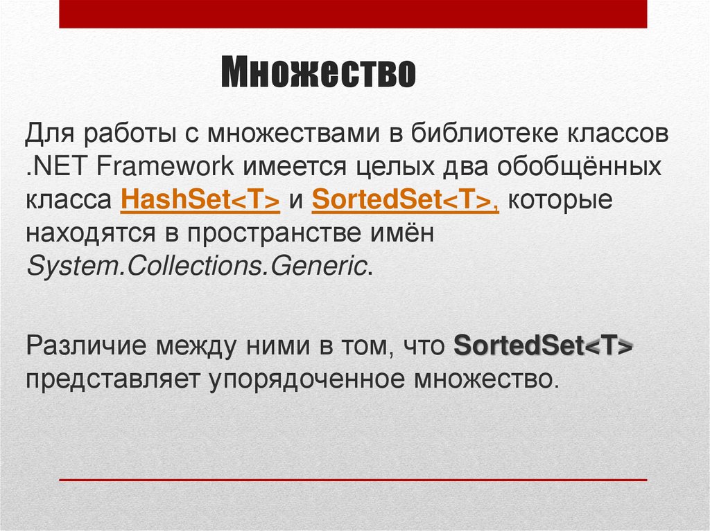 МножествоДля работы с множествами в библиотеке классов